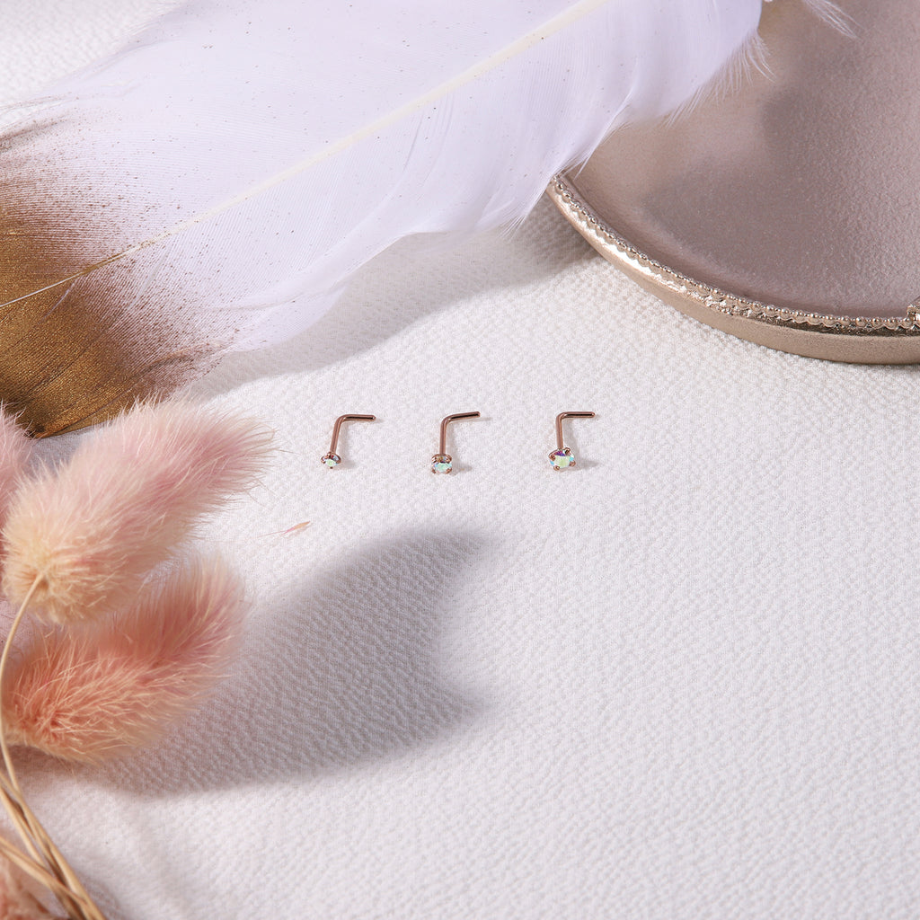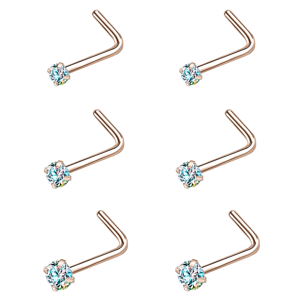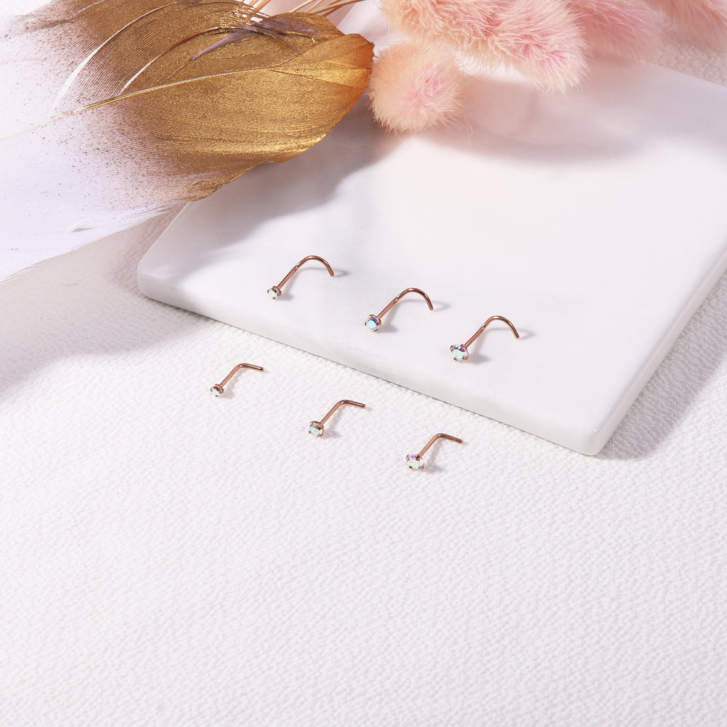 6 Pcs/Set 20G AB Zircon Nose Studs Piercing L-Shape Nose Rings Rose Gold Plated Nostril Piercing