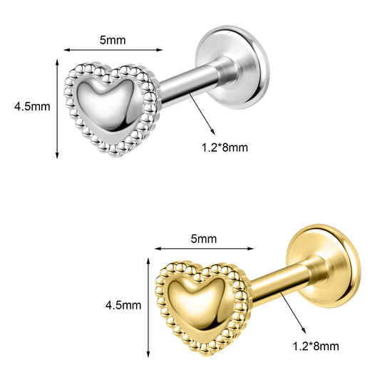 16g Heart Labret Ring Flat Back Stud Earring Conch Helix Lip Piercing