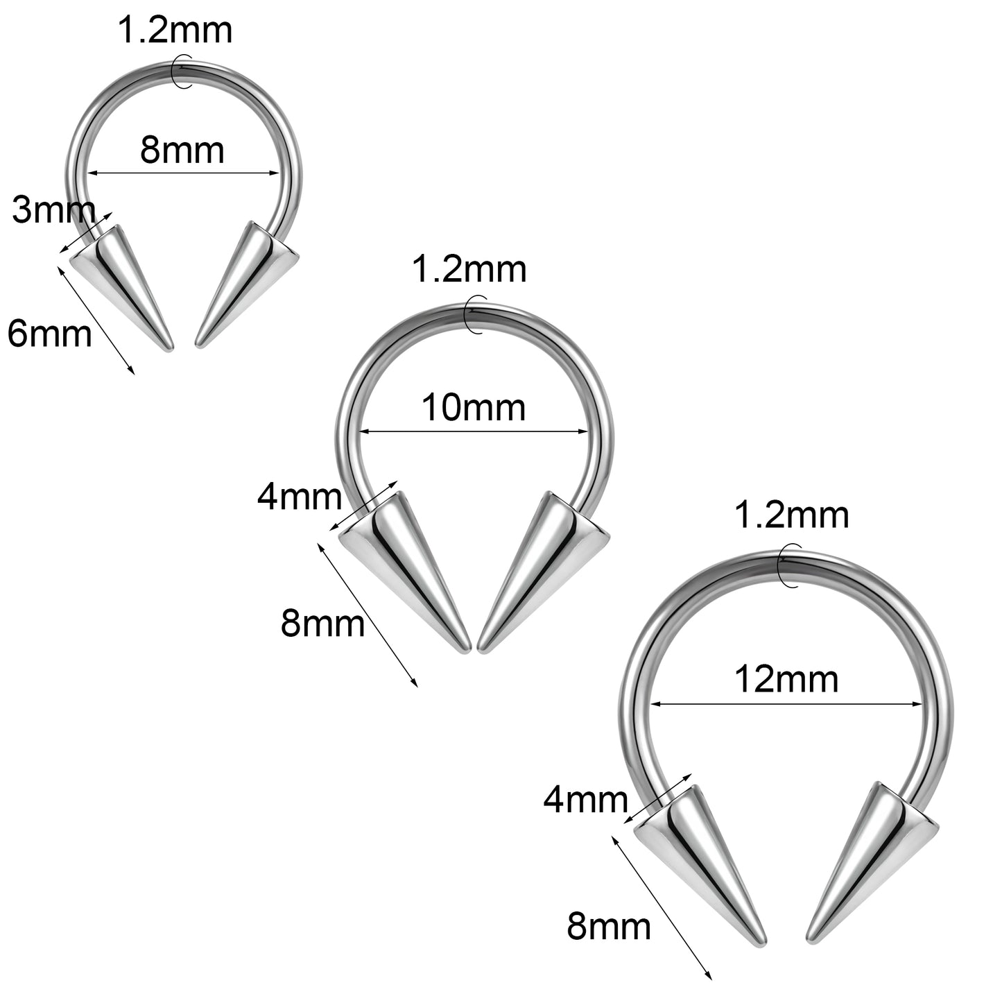 - Gauge: 16g(1.2mm) Bar Thickness, Inner Diameter: 8mm, 10mm, 12mm. Spike Size: 3*6mm/ 4*8mm.