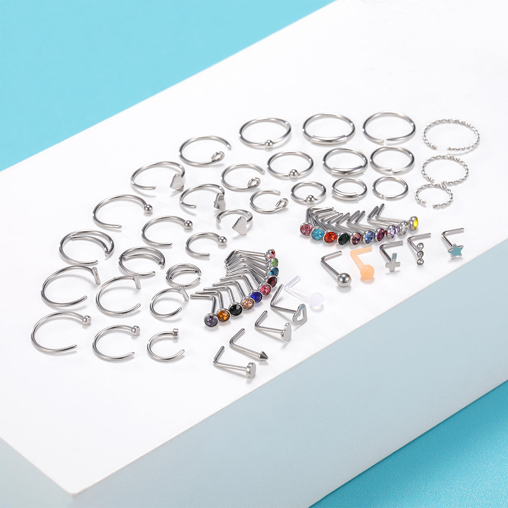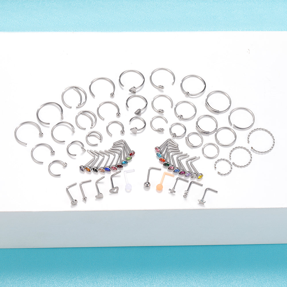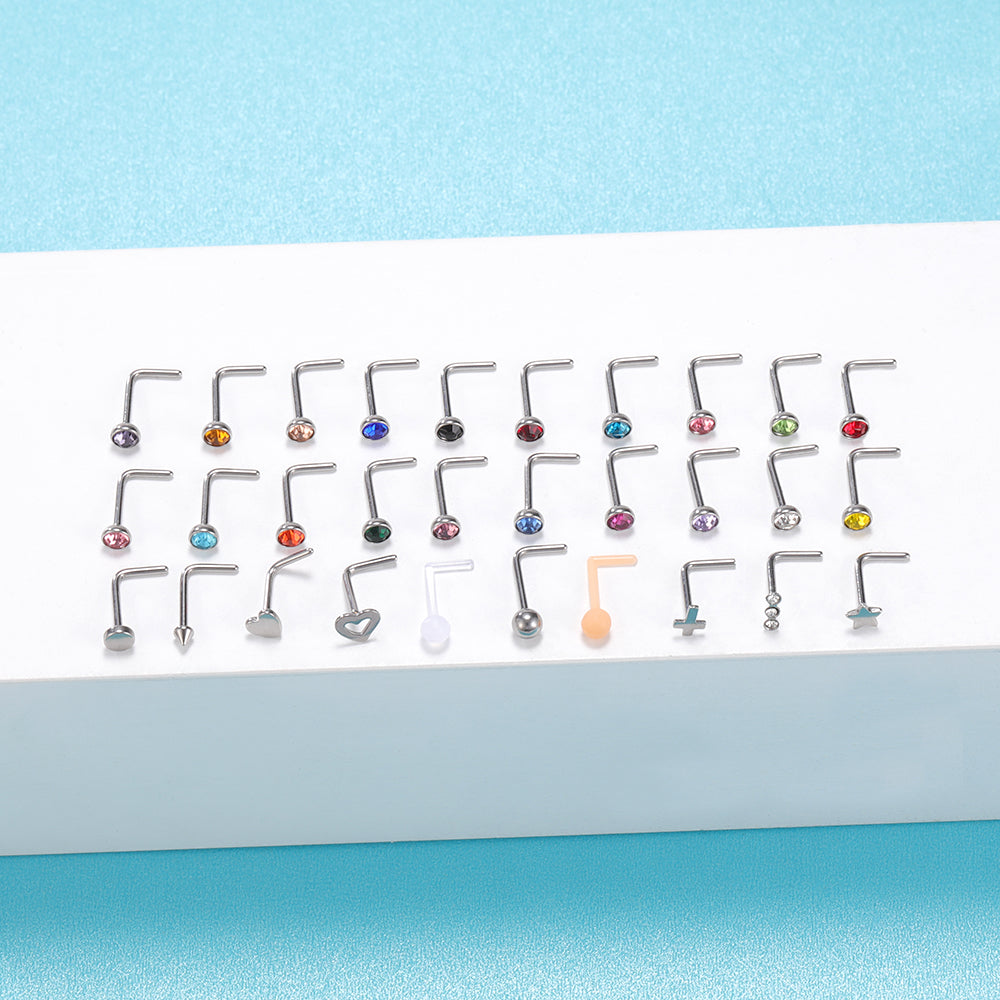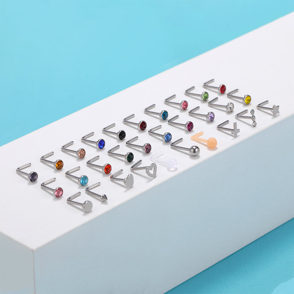 60Pcs/Set Stainless Steel Nose Rings Crystal/Acrylic L Shaped Piercing-Economic Set