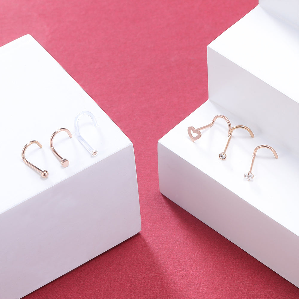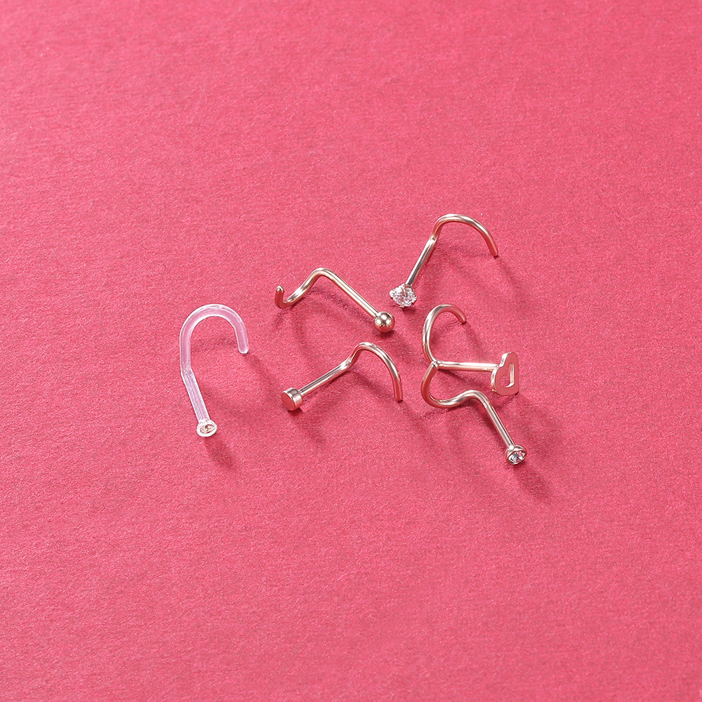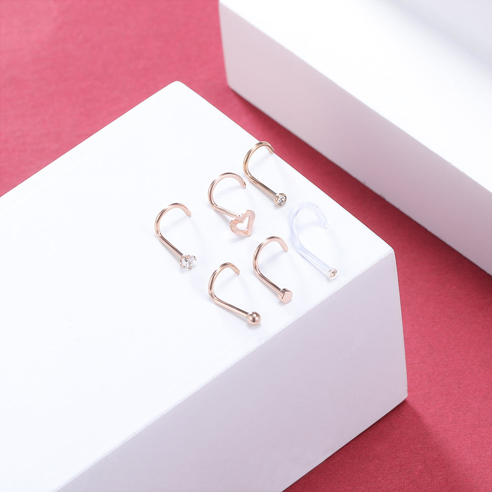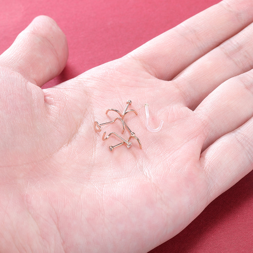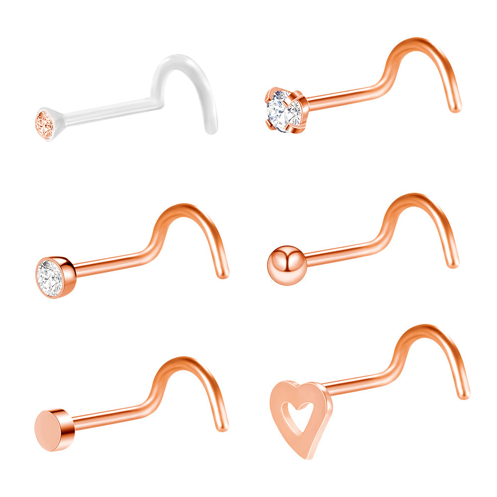 6Pcs/Set Rose Gold Nose Stud Rings Clear Bioflex Nose Screw Piercing-Economic Set