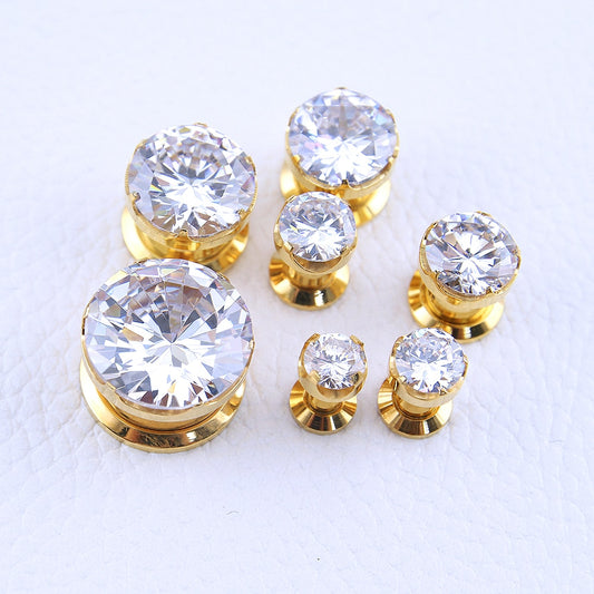 1 Pair 4-16mm (6g-5/8") Big Zircon Ear Plug Tunnels Gold Plated Stainless Steel Ear Gauges