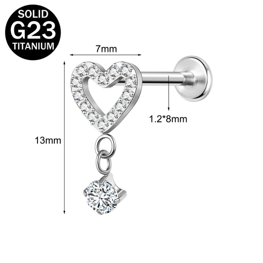 16g G23 Titanium Labret Ring Heart Zircon Stud Earring Threaded Conch Helix Lip Piercing