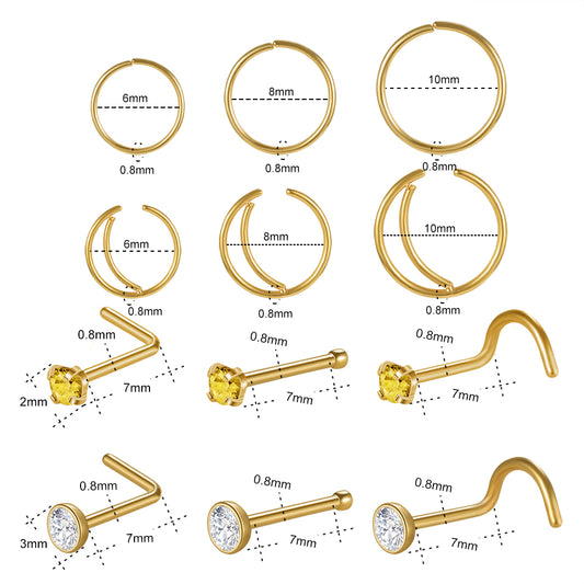 12Pcs/Set Gold Nose Stud Ring Piercing Nose Bone/L Shaped/Nose Screws-Economic Set