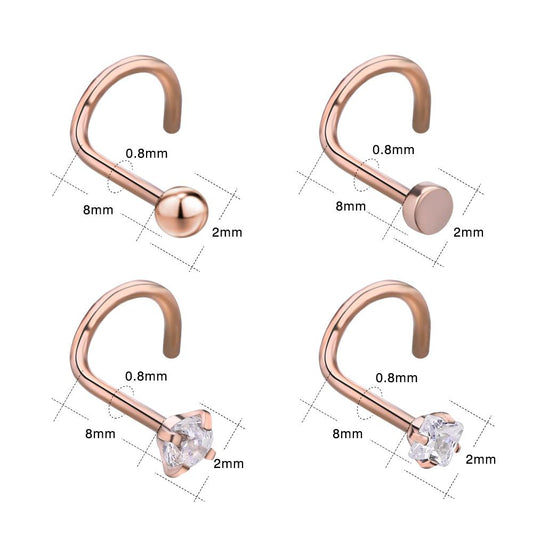 4 pcs/set 20g Thin Rose Gold Nose Rings Piercing Crystal Zirconia Curve Nose Studs-Economic Set