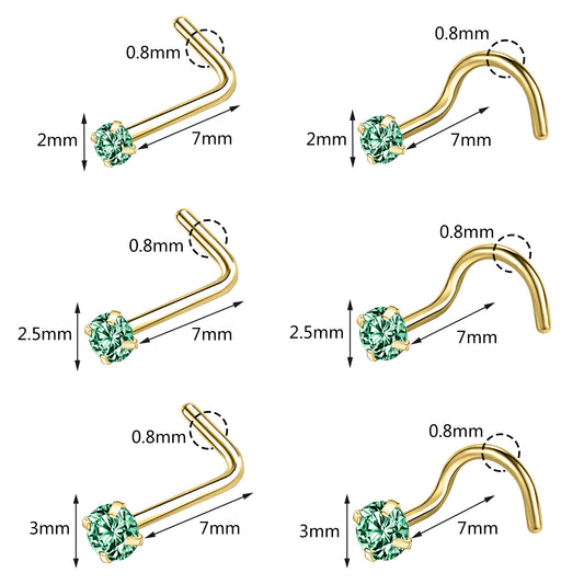 20g Green Zircon Nose Studs Piericng Gold Plated L Shape Corkscrew Nose Rings