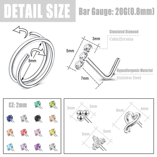 16Pcs/Set 20g L Shaped Nose Stud Hoop Nose Rings CZ Moon Flower Nostril Rings Set