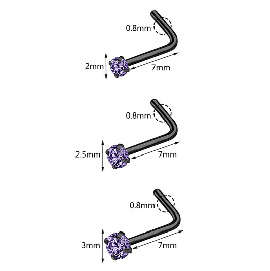 6 Pcs/Set 20G Violet Crystal Nose Stud Piercing L-Shape Nose Ring Black Nostril Piercing