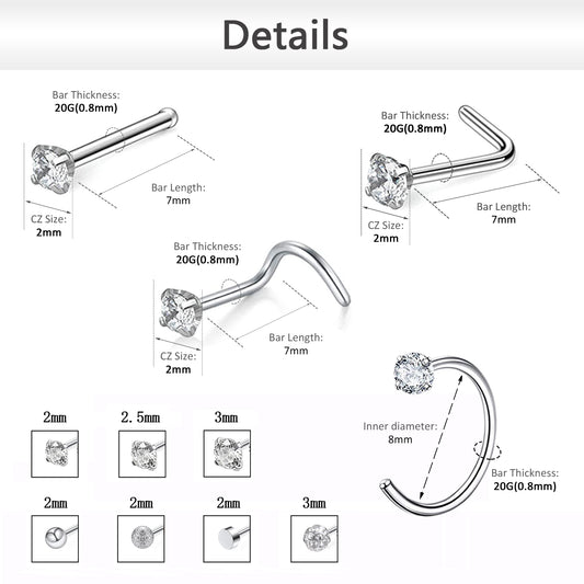 20Pcs/Set 20g Nose Corkscrew Stud Hoop Nose Rings CZ Nose Piercing