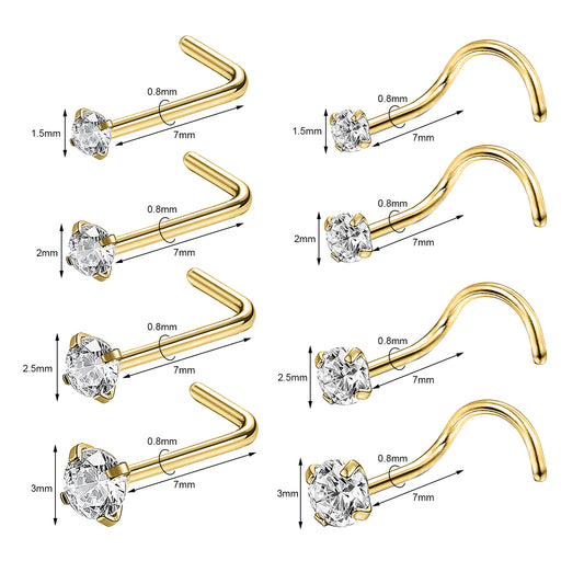 8Pcs/Set CZ Nose Piercing L Shaped/Screws Gold Nose Rings-Economic Set