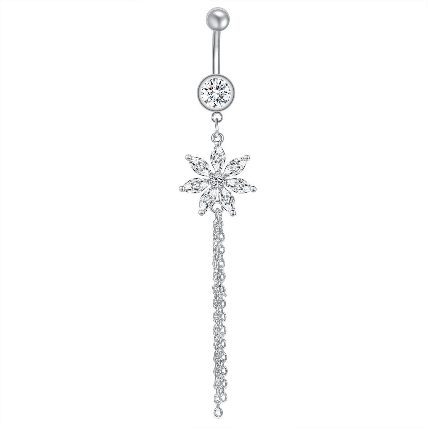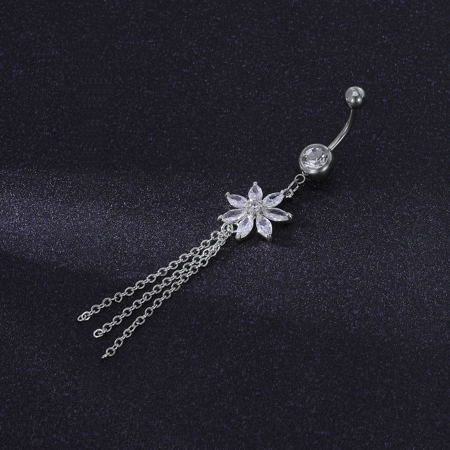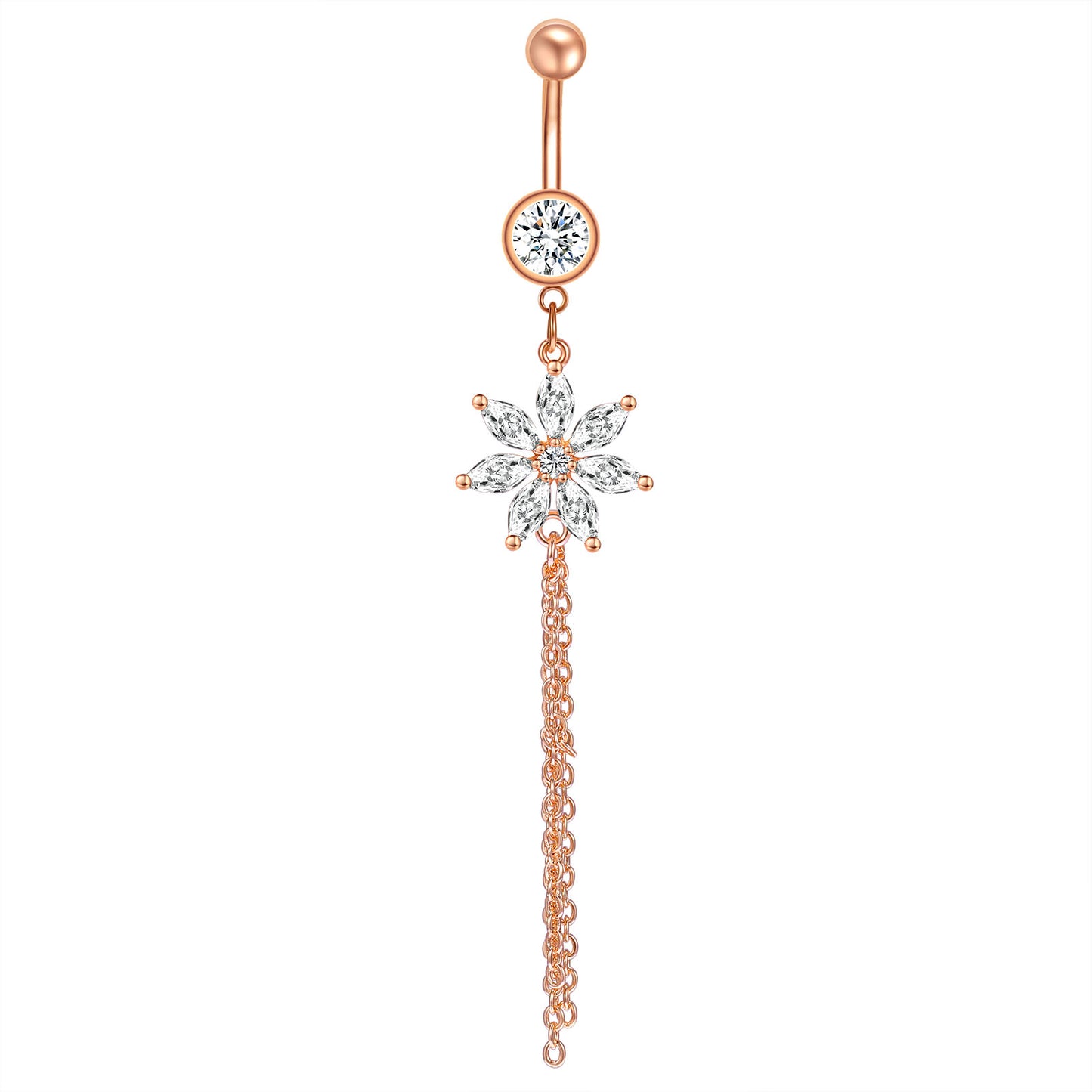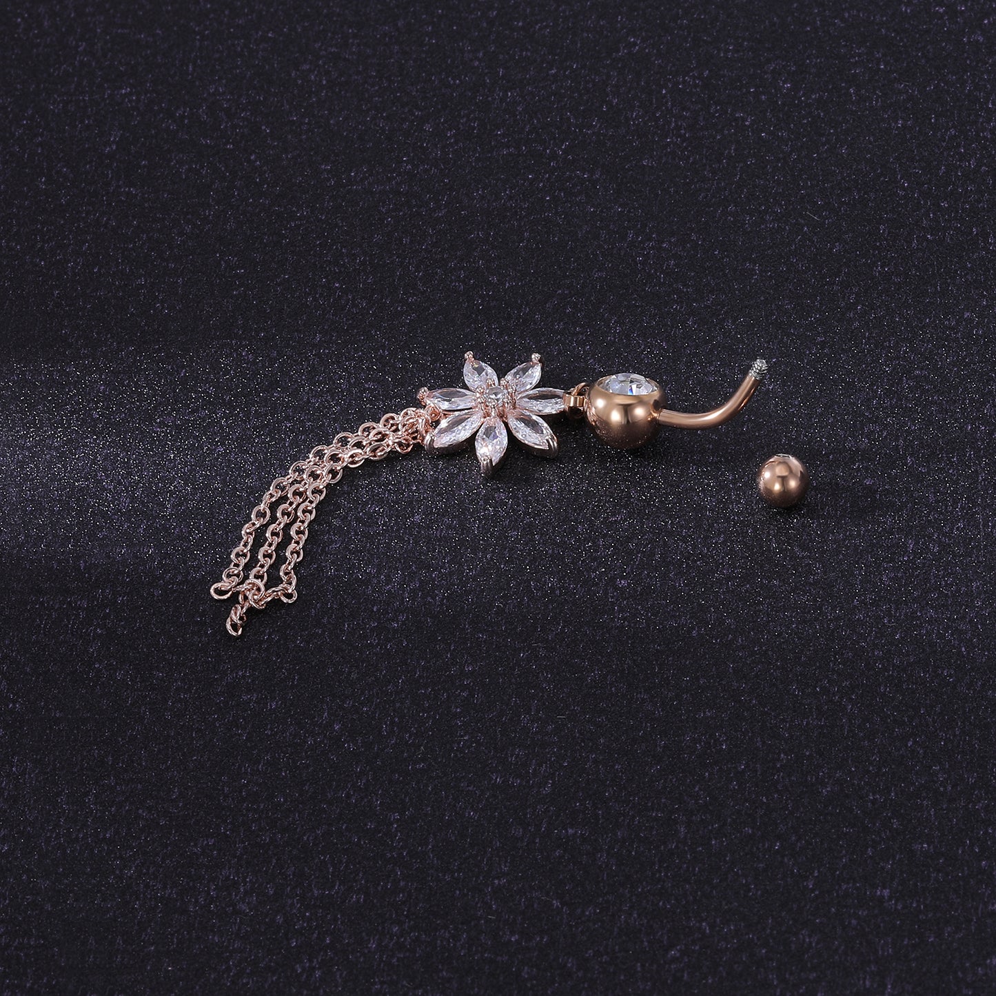 - Navel Ring Design: rose gold drop dangle flower zirconia and tassels, classial style.