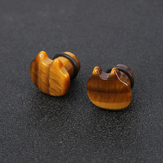 6-16mm Cute Cat Natural Organic Tiger Eye Stone Ear Plug Gauge Single Flare Ear Expander
