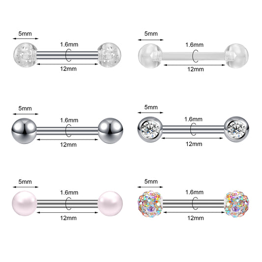 12Pcs/Set 14g Sliver Skull Pearl Crystal Tongue Rings Ball Tongue Piercing Barbell-Economic Set