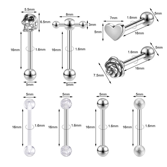12Pcs/Set 14g Sliver Skull Flower Tongue Rings Heart Ball Tongue Piercing Barbell-Economic Set