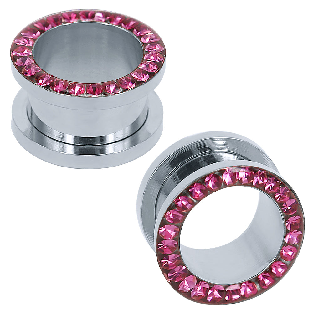 1 Pair Ear Plug Tunnel Pink CZ Crystal with Clear Coating Stainless Steel Ear Gauges
