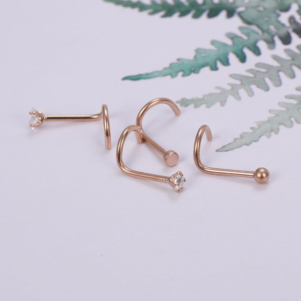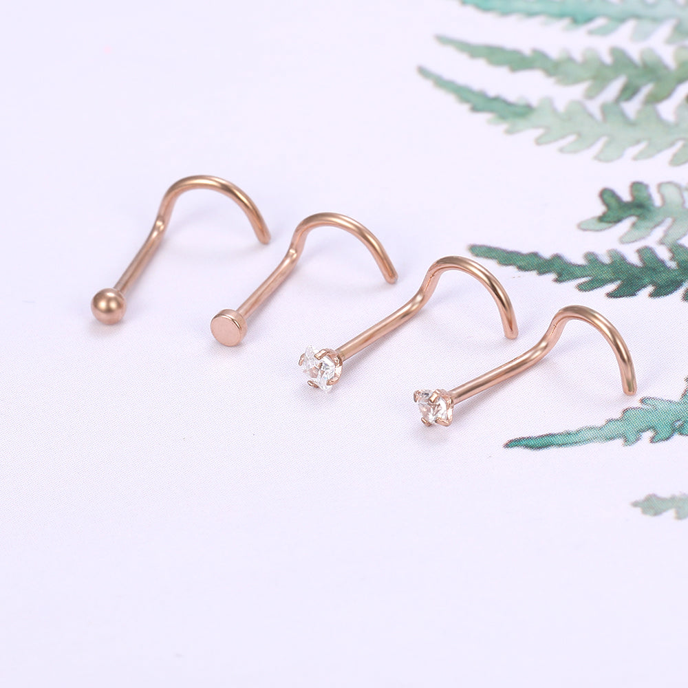 4 pcs/set 20g Thin Rose Gold Nose Rings Piercing Crystal Zirconia Curve Nose Studs-Economic Set