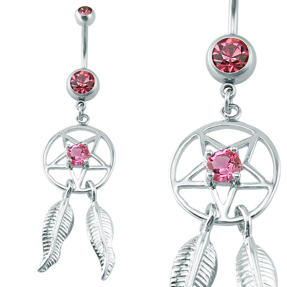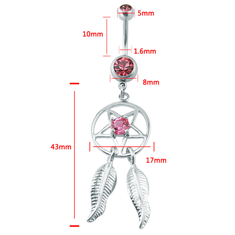 - Navel Ring Design: Dreamcatcher Pink Zircon Dangle Feather Belly Button Rings.