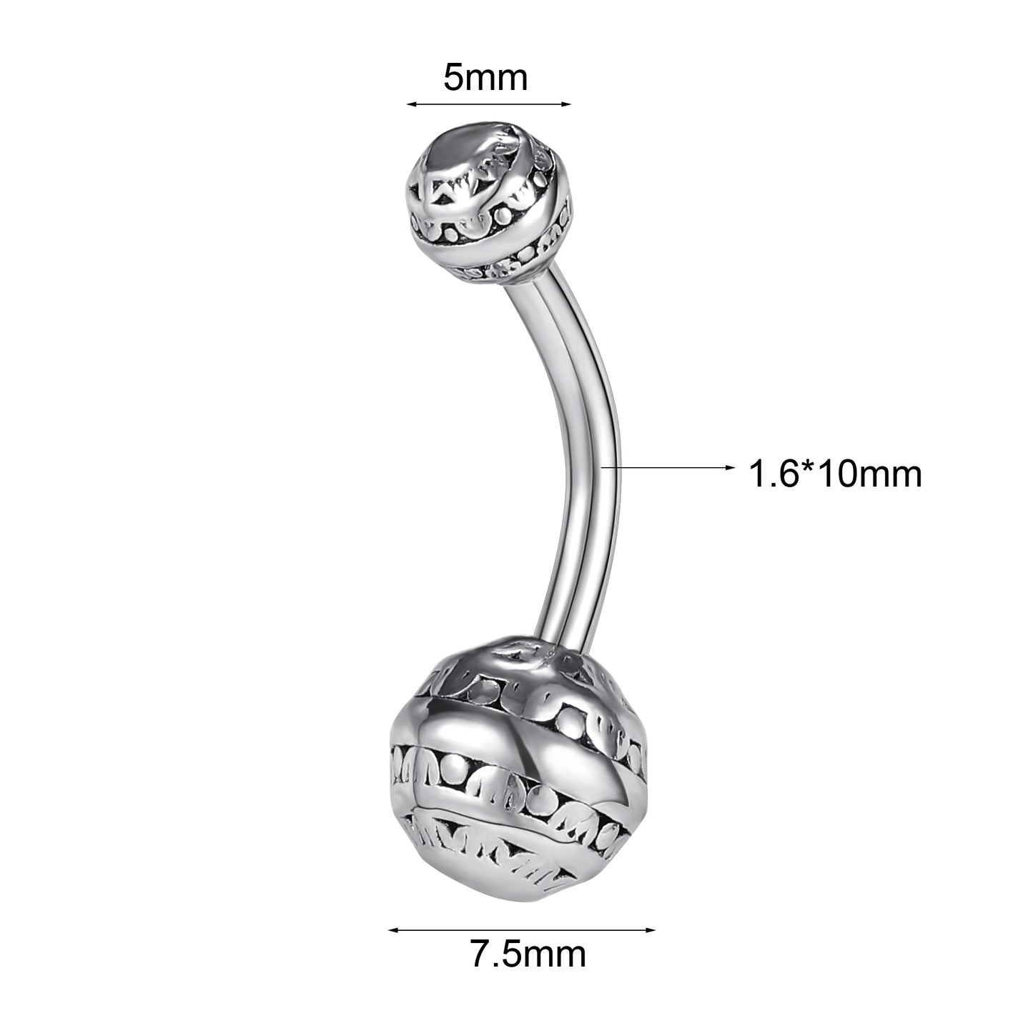 - Belly Bar thickness : 14 gauge (1.6mm), bar length: 10mm, Top Ball Size: 5mm, Belly Bottom Size : 7.5mm.