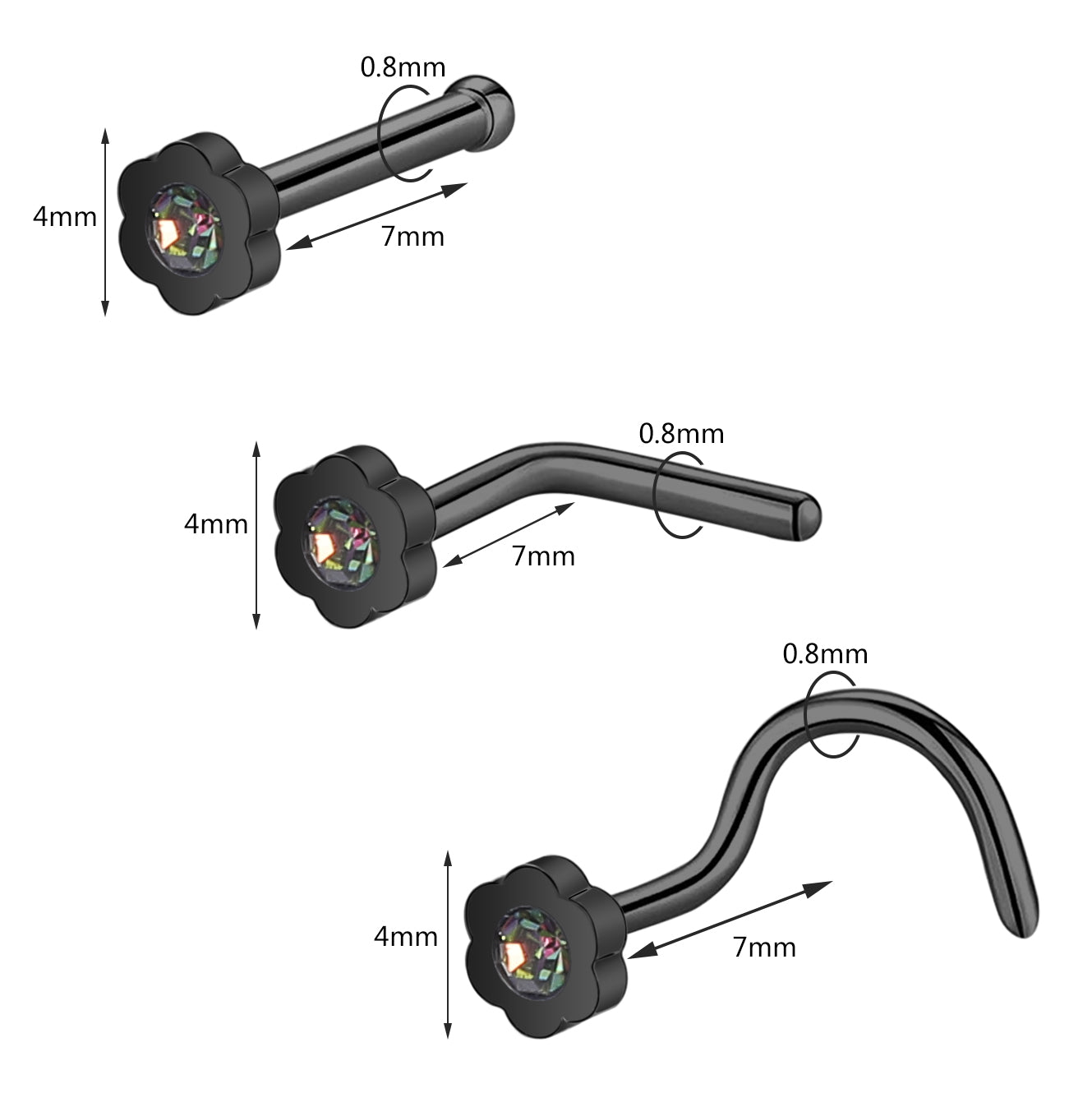 - Nose Stud Size: Top Diameter: 4mm. Pin Length: 7mm, Gauge (Thickness): 20 Gauge (0.8 mm).