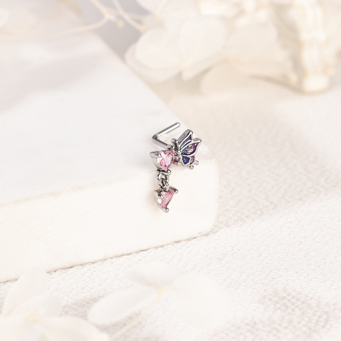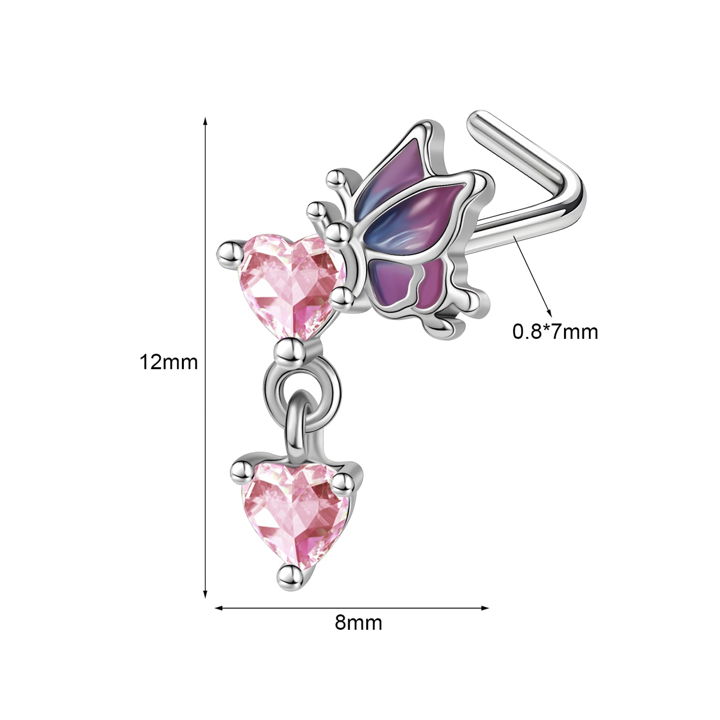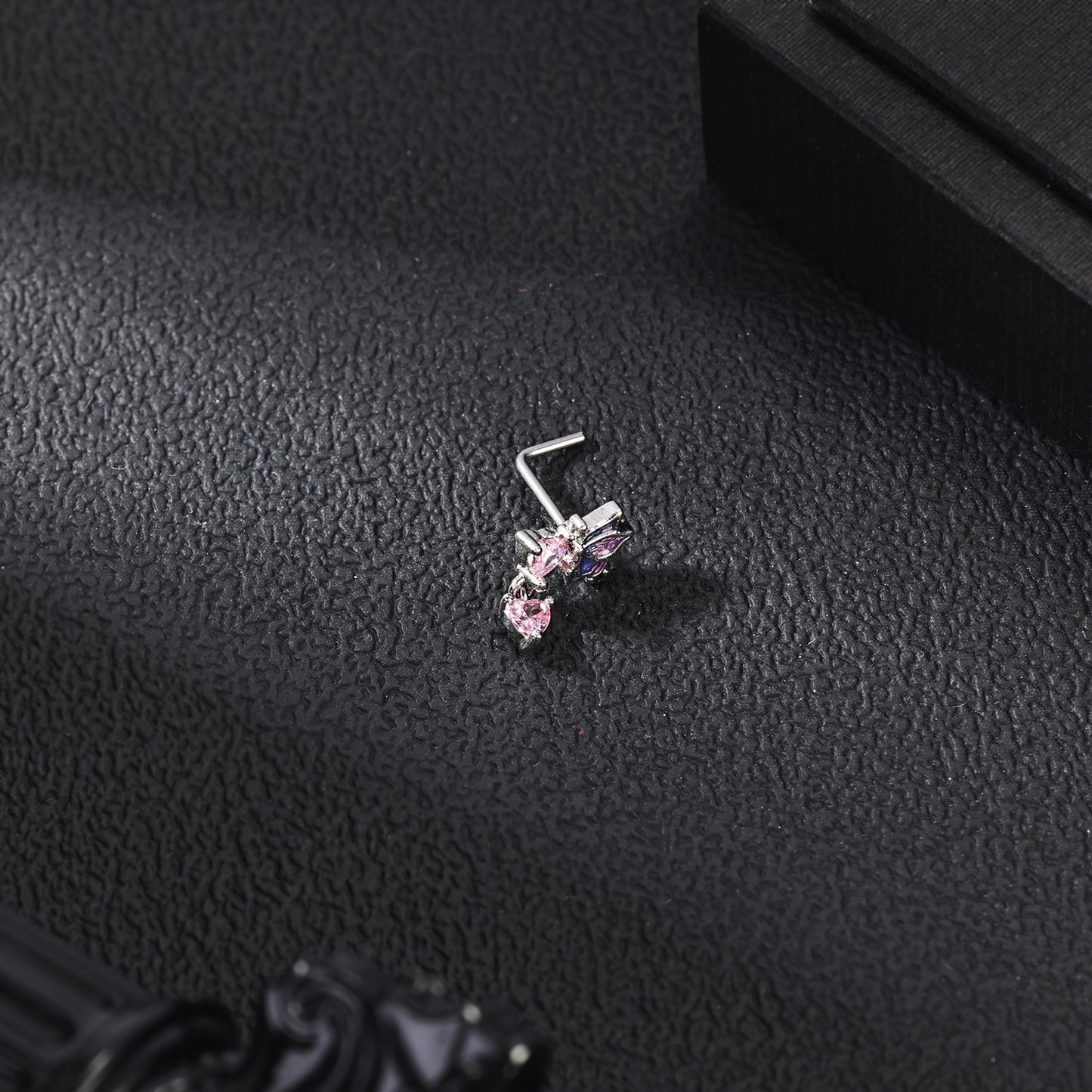 20G Heart Dangle Nose Studs Piercing L Shape Nose Rings Pink Zirconia Nostril Piercing