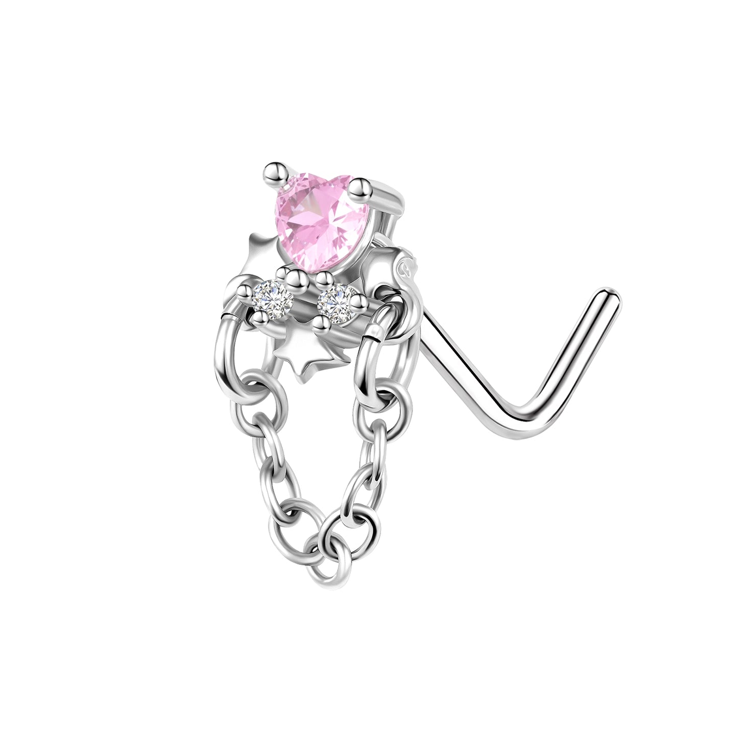 20G Heart Nose Studs Piercing L Shape Nose Rings Pink Zirconia Nostril Piercing