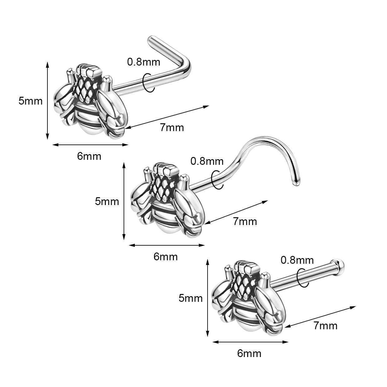 - Nose Stud Size: Top Diameter: 5mm*6mm. Pin Length: 7mm, Gauge (Thickness): 20 Gauge (0.8 mm).