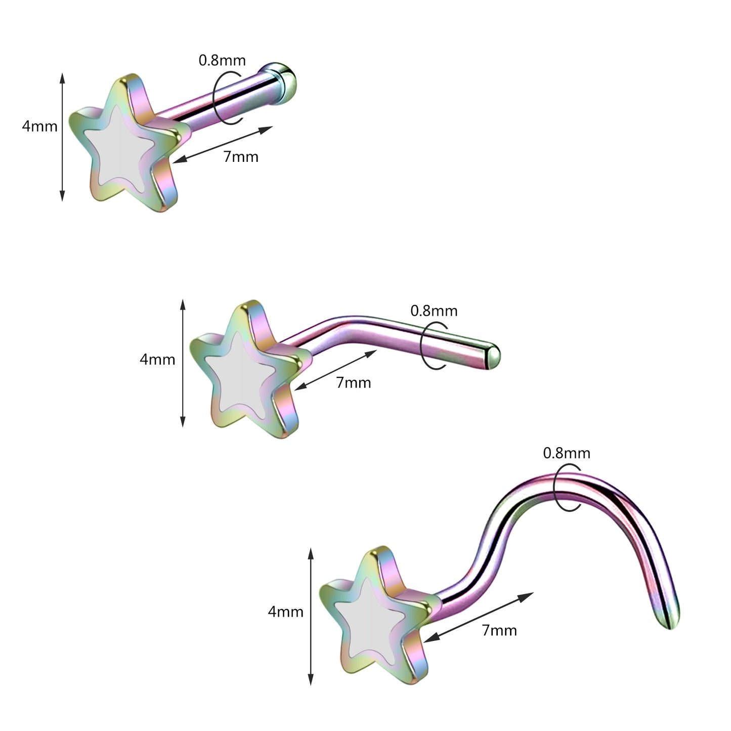 - Nose Stud Size: Top Diameter: 4mm. Pin Length: 7mm, Gauge (Thickness): 20 Gauge (0.8 mm).