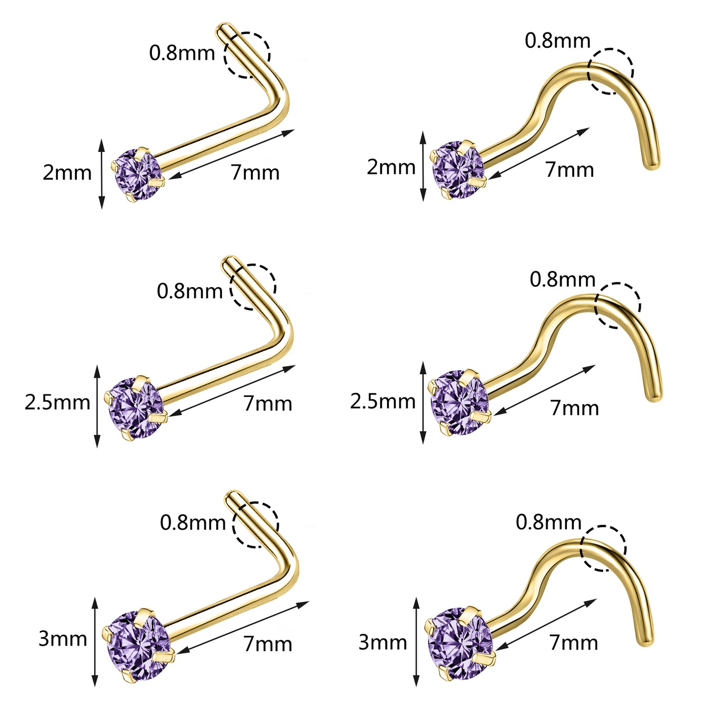 - Cubic Zirconia Size: 2mm/2.5mm/3mm, Pin Length: 7mm, Gauge (Thickness): 20 Gauge (0.8mm).