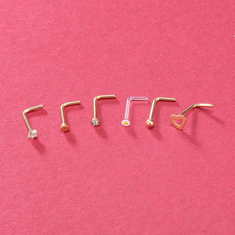 6Pcs/Set Gold L Shaped Nose Stud Rings Clear Bioflex Nose Piercing-Economic Set