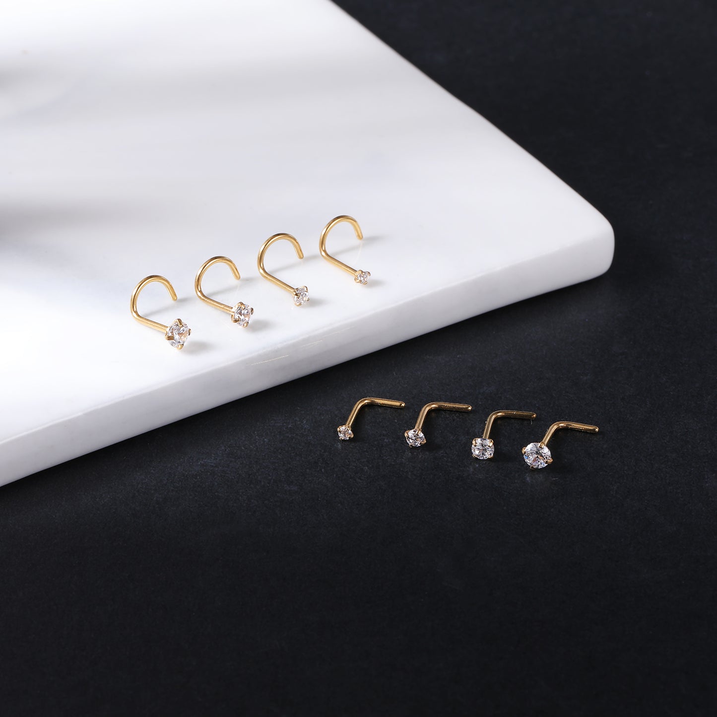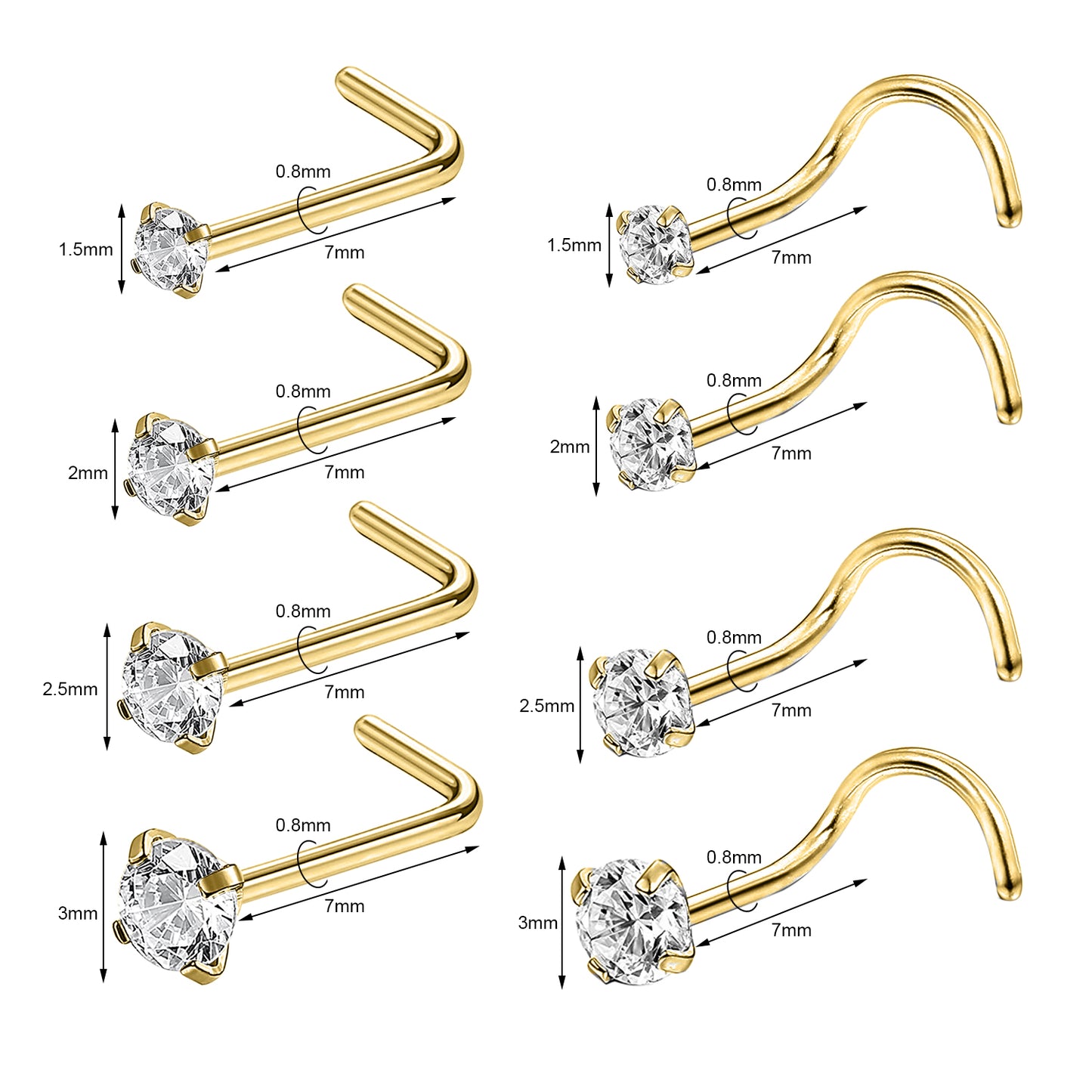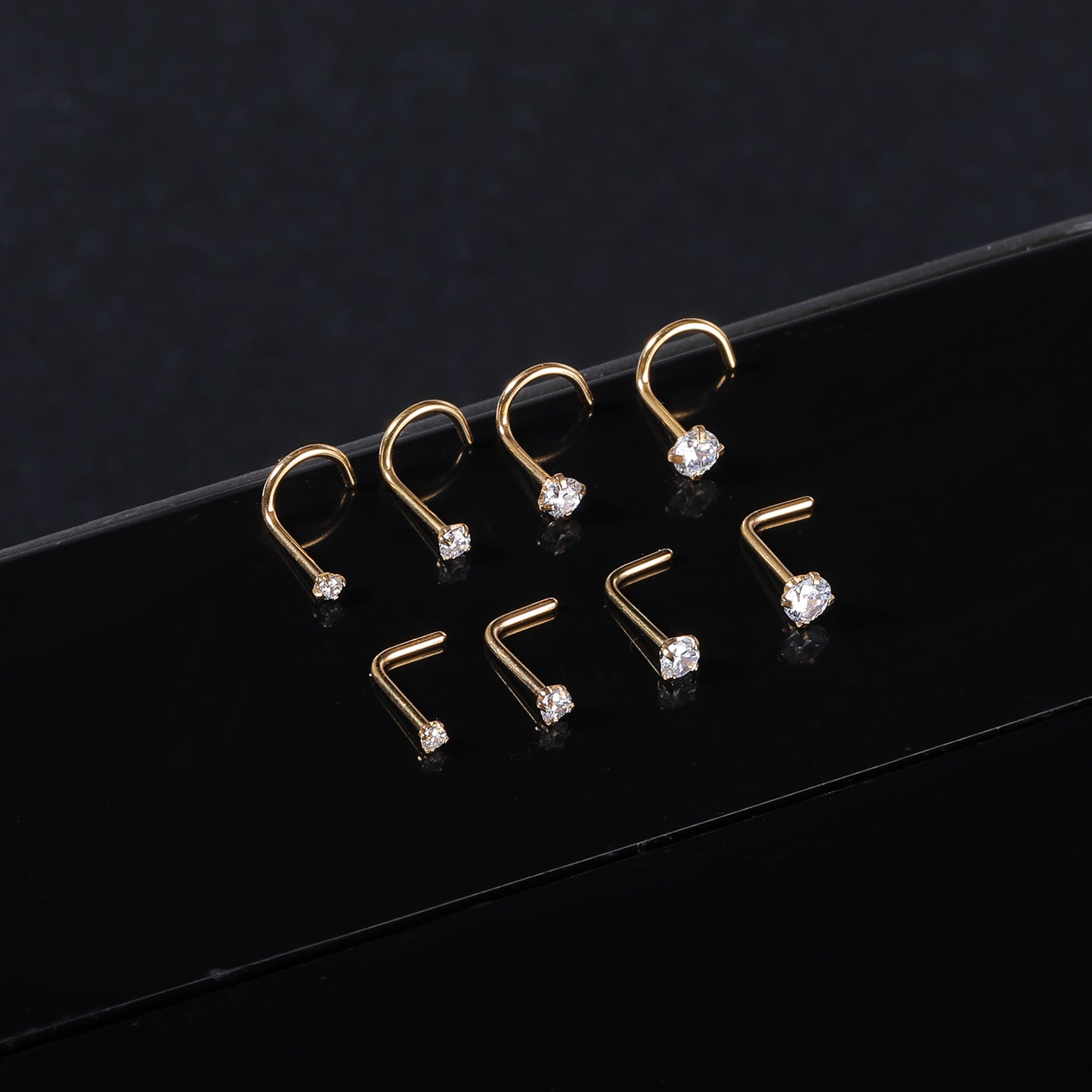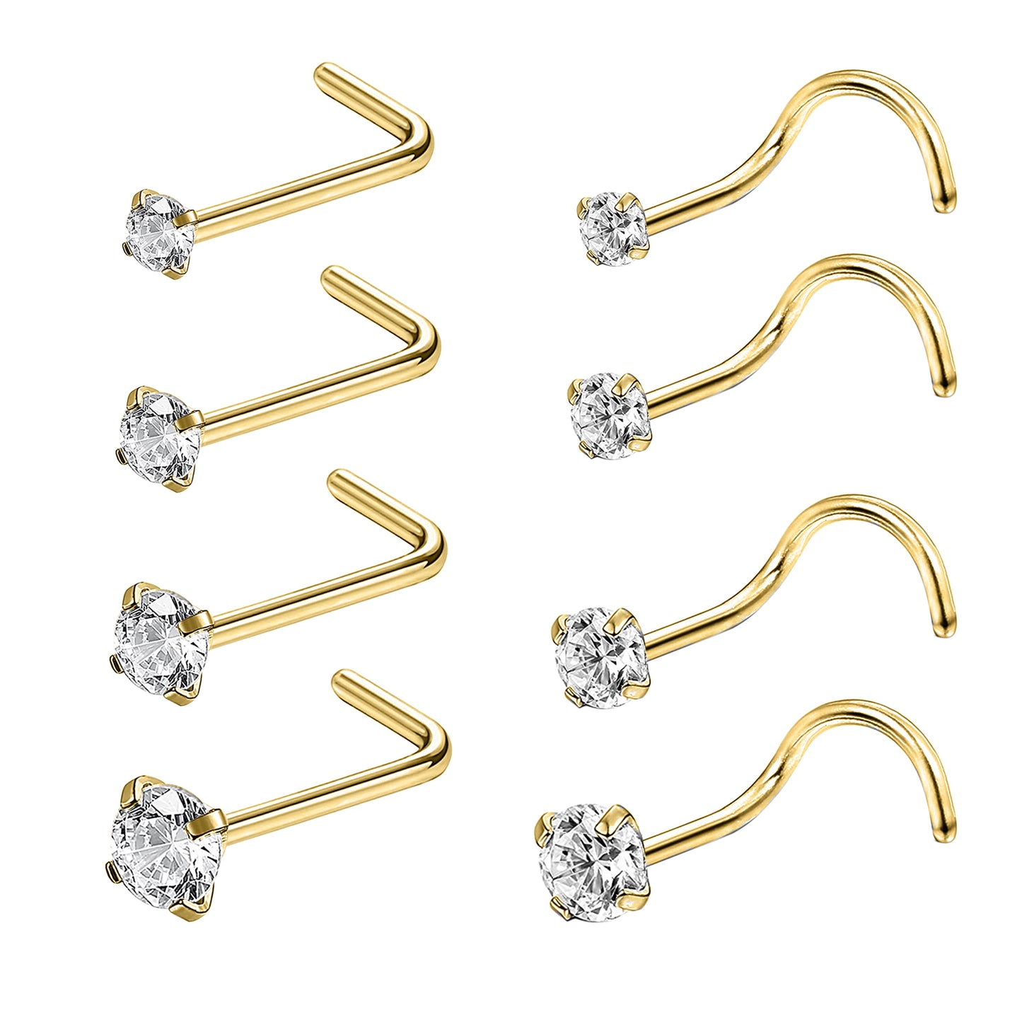 8Pcs/Set CZ Nose Piercing L Shaped/Screws Gold Nose Rings-Economic Set